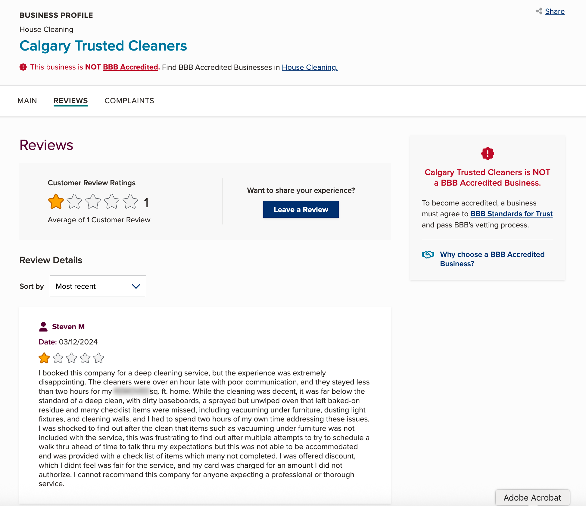 While Calgary Trusted Cleaners is a known local cleaning provider, some customers have reported reliability and service consistency issues. For example, a Better Business Bureau review describes cleaners arriving over an hour late with poor communication and completing less work than expected during a scheduled deep cleaning.